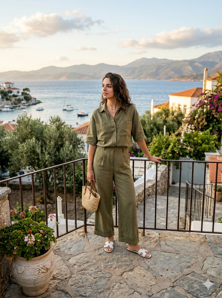 A stylish, olive green linen matching set for a relaxed, chic summer look. Features a short-sleeved button-up shirt and high-waisted, wide-leg trousers.