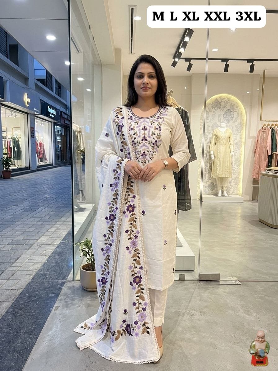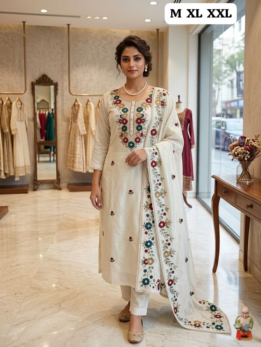 - ​Detailed Embroidery: The kurta showcases a beautifully embroidered neckline and delicate floral motifs scattered across the front.